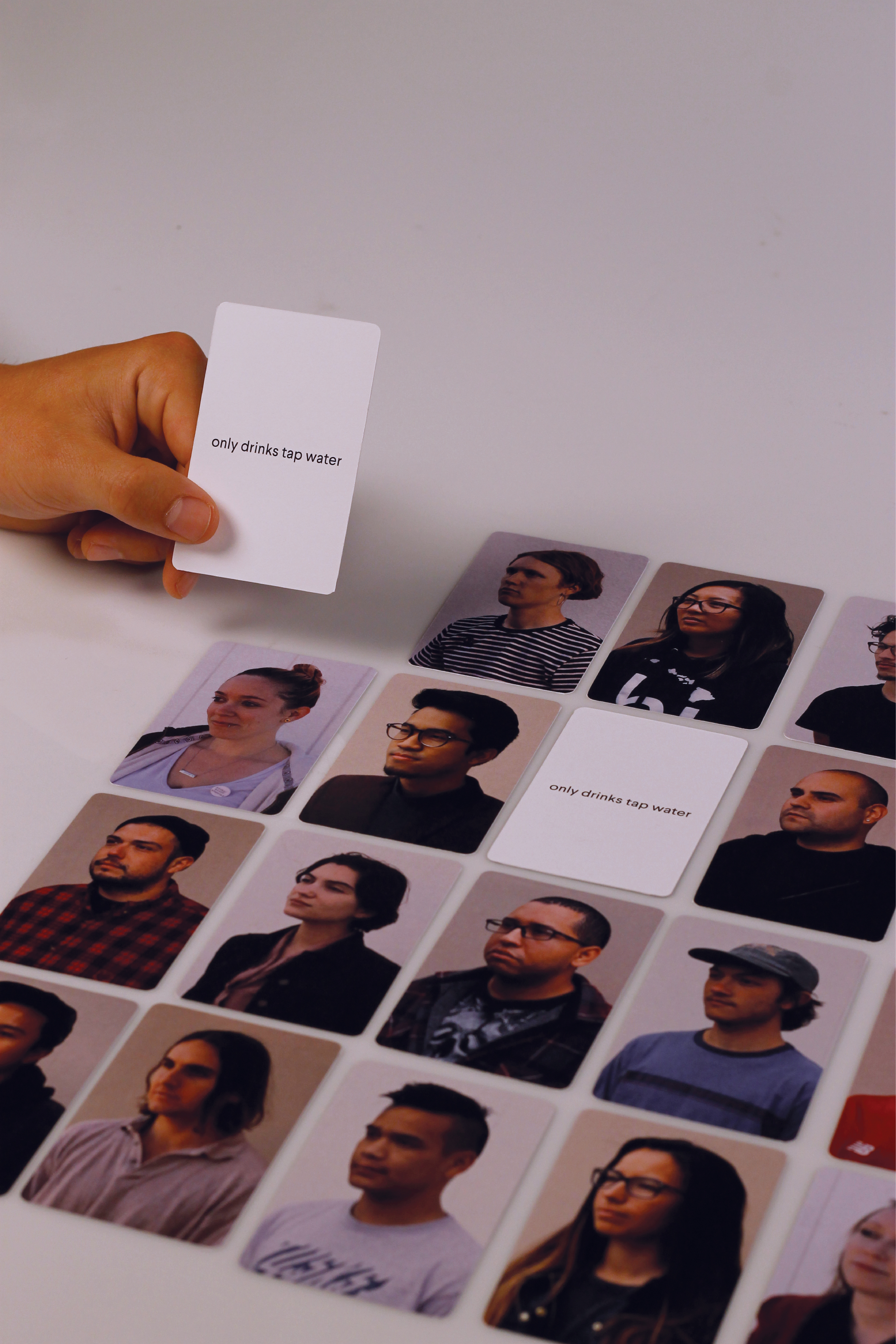 similar to the card game memory, this game is played by turning over cards in an attempt to match the hidden sides together. the player must turn over cards in pairs and if the back side matches, they keep the cards. if the hidden sides do not match they turn the cards back over and try again. the goal is to remember what is on the hidden sides of the cards that were unsuccessfully matched. the difference with one, plus one, equals one is that the player acts as a computer dating algorithm to match lives together. the cards act as online profiles, with their best features listed on the back to match up with and start relationships. most of the profiles match with nobody, and a few match with more than just one. included in the game box is a poster detailing one of the ‘lost’ souls that does not get to partner with anyone and the conclusion that one is whole all on their own, not with the addition of someone else.